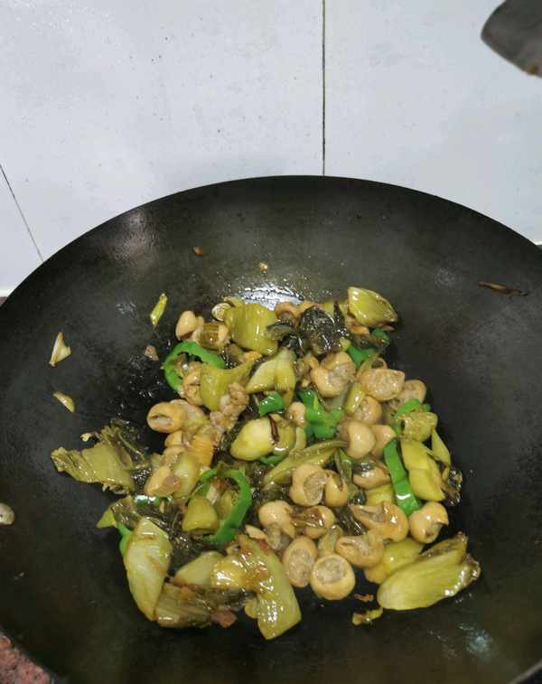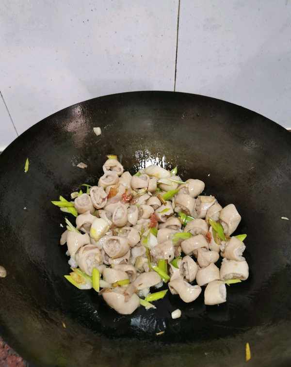 6:小火炖一会,等猪大肠入味,撒一勺盐调味,加少许胡椒粉,水淀粉勾芡,一茶匙鸡精,最后撒上葱花,炒几次。