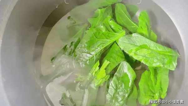 第二步:汤锅中倒入水,撒少许盐,将菠菜叶放入锅中焯30秒,捞出沥干水分,将菠菜切成小块。