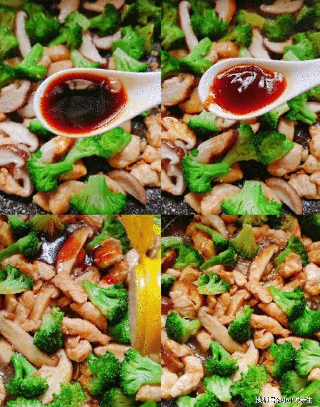 第六步:倒入西兰花和香菇,香菇炒软,西兰花炒碎,加少许生抽和蚝油,加盐和胡椒调味。