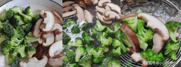 第三步:锅中烧开几碗水,撒少许盐,加几滴食用油,将香菇和西兰花焯水2分钟,捞出沥干水分,备用。