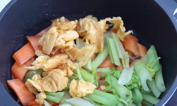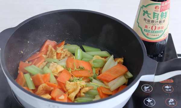第五步:锅中放少许食用油,将胡萝卜、芹菜炒至烂烂,加入煎好的鸡蛋块。