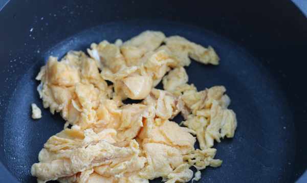 第6步:让鸡蛋与配料混合。不要将蔬菜煮过头,以免损失营养价值。加少许盐和酱油炒至顺滑,用抹刀搅拌。