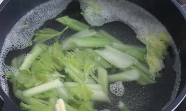 第一步:准备好以上材料,去药明叶,切药明根,将药明切成几小块,准备一锅水烧开,加入一勺盐,将药明用盐焯一下水让西芹酥了,颜色很翠绿。