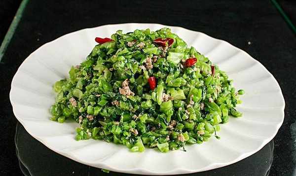 6:无需清洗锅底。雪里红部分快炒,主要是吸收肉末的油脂,加点小米椒提色提味,加少许白糖拌匀。