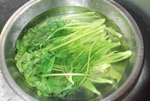 2:从锅中准备一壶清水。煮沸后,让雪里莲花烧几十秒,泡在冷水中,雪里莲花切成小块,蒜切碎,姜洗净切薄片待用。使用。