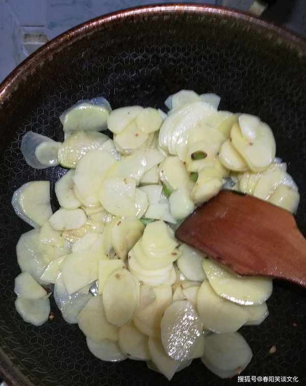 3:起锅加冷油预热,放入葱姜爆香,快速翻炒土豆片至碎,撒少许盐,加一小勺水稍煮片刻.