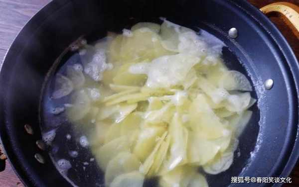 1:500克小土豆洗净,小土豆全部刮干净,土豆切成几片薄片,土豆片放入容器中,加足量的水,土豆片泡一会,抓起上面的淀粉洗掉表面,反复洗涤后检查水分。