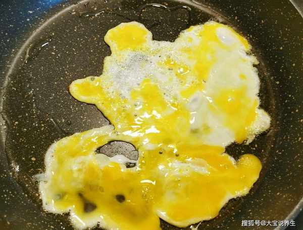 第四步:拿起锅,让锅加热一会儿。油热后倒入调好的蛋液,将锅底铺平,一切成型,快速翻炒片刻,备用。