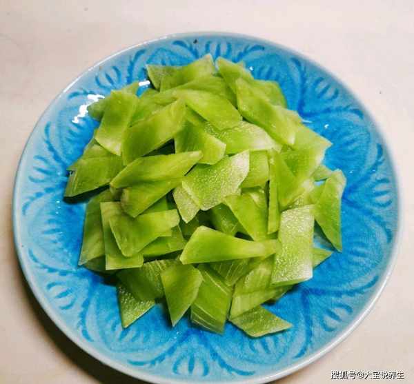 第一步:准备好以上材料,将生菜的叶子全部去掉,然后用刀剥去生菜皮,切掉生菜的白茎,然后将生菜切成菱形块待用,用盐泡一下水。