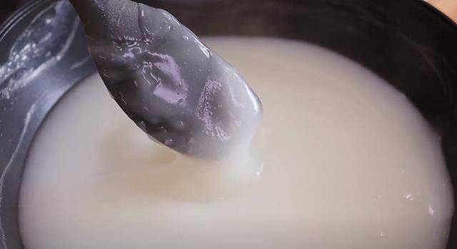2、锅中加入1200ml清水,大火烧开,水开后搅拌淀粉水,然后慢慢倒入锅中,注意一边倒一边搅拌,一直加热到看起来这样out气泡不断吐出的程度,才算熟了。