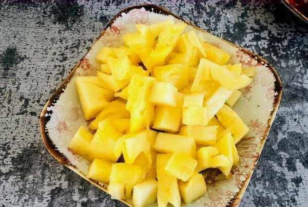 第二步:将菠萝放入碗中。菠萝直接吃很酸。您必须添加足够的水,撒上盐并搅拌。菠萝含有一种蛋白酶。盐可以中和蛋白酶。避免吃菠萝刺激口腔。菠萝这样泡出来吃起来更甜。