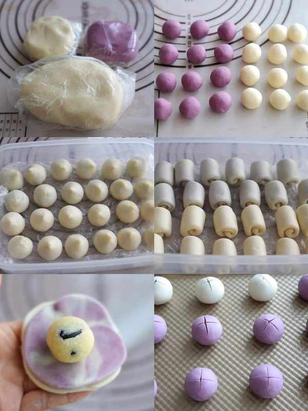 2、水油皮面团均匀分成24等份,整理出光面密封保存备用;白色油酥和紫色油酥面团分成12等份,搓圆密封保存备用;