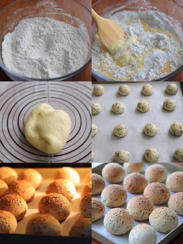 4、最后加入黑芝麻揉均匀即可;我们的面团也就好了。然后分成小剂子,每个大概在25克左右,分好的每个小剂子揉圆,摆放在烤盘上面;