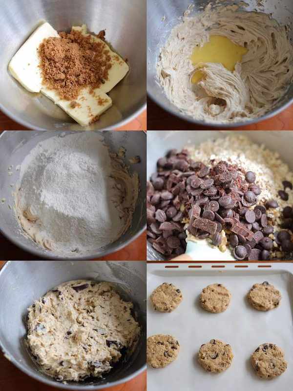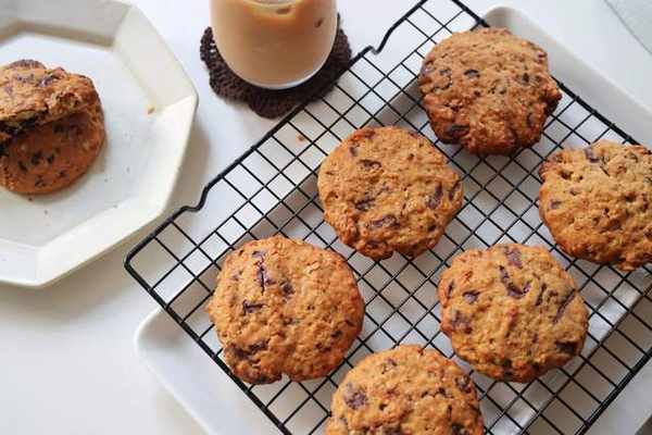 制作配料:黄油100克、赤砂糖40克、白糖10克、鸡蛋1个、面粉125克、燕麦20克、小苏打1克、泡打粉1克、盐2克、巧克力100克、核桃碎80克