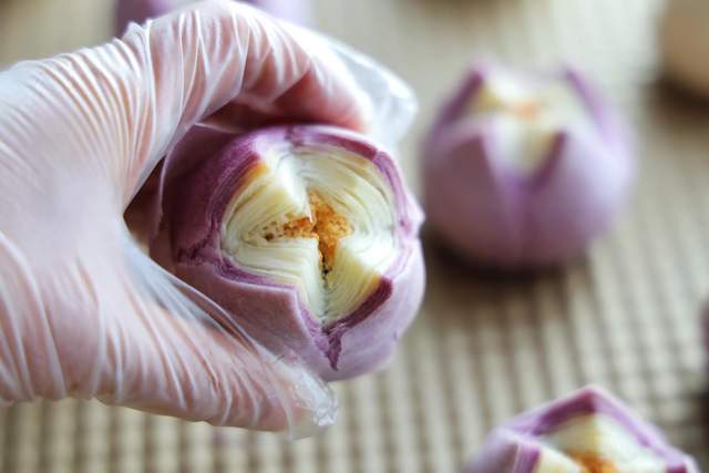 紫色油酥:低筋面粉65克、猪油35克 、紫薯粉5克