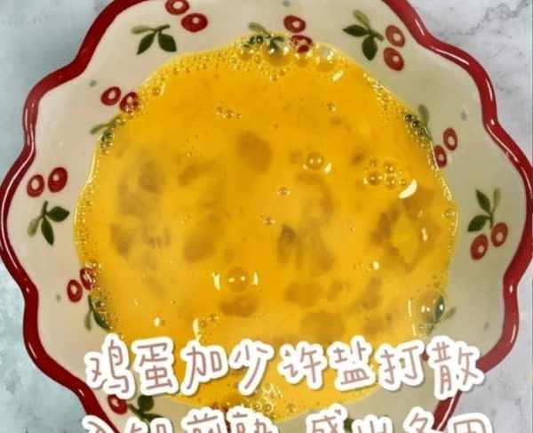 第三步:准备一个容器,将两个鸡蛋打入地面,快速搅拌鸡蛋,加入胡椒粉,一茶匙料酒,稍凉后用力搅拌蛋液。