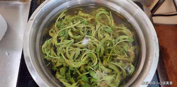 第一步:将新鲜药明芽的老茎切掉,然后用清水反复冲洗干净,准备一锅清水,撒盐烧开,加入药明芽用水焯3分钟,待药明明芽变绿,捞出晾凉备用。