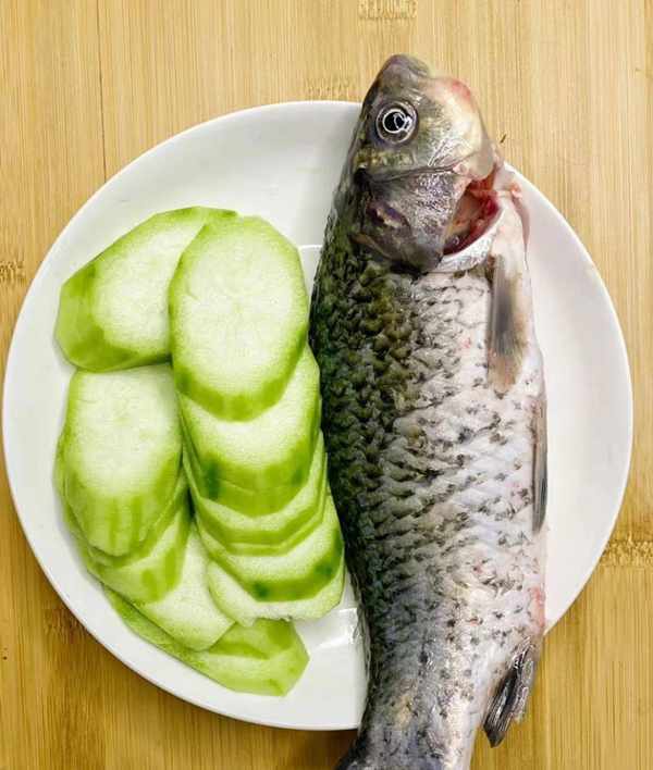 第一步:准备新鲜鲫鱼和嫩丝瓜,新鲜鲫鱼去内脏、去鳃,刮去胃里的黑膜,用清水反复清洗。