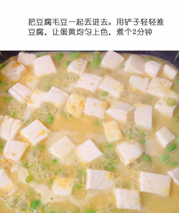 5:等到咸蛋黄溶化后,加入毛豆和蘸好的豆腐,用锅铲轻轻推入豆腐,不要让豆腐破裂。