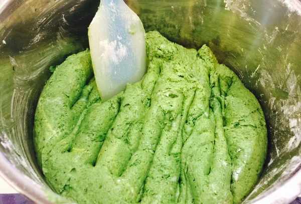 第五步:把糯米粉和艾叶充分吸收,还可以加一点水,注意一次加一点水,防止艾叶面团太稀,继续揉面团,把面团捏进去小剂量。