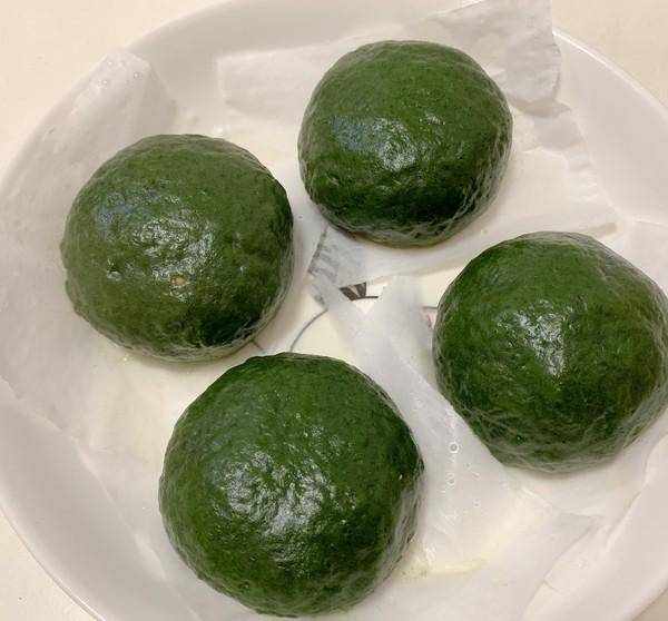 第六步:将面团压成圆形,面团发酵一会,等待艾叶面团膨胀。