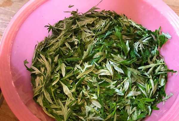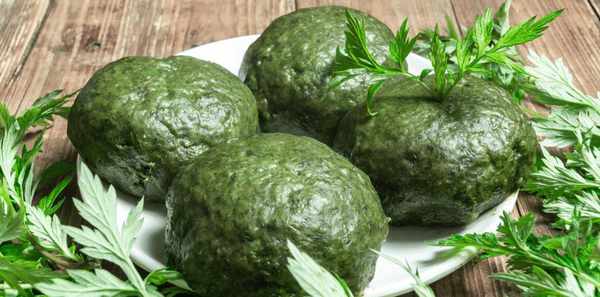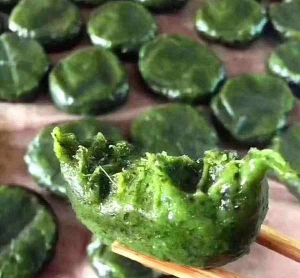 小贴士:药明是一种野生药材。药明的叶子里有些脏东西需要特殊处理。需要将药明清洗干净,然后将药明用盐水泡一下,然后将药明焯水,加入一些食用碱以保持药明的翠绿色,将药明挤出水分,将药明切段,以便放入糯米粉中。糯米粉和艾叶的比例是1:1,也可以加少许糖,把面团揉光滑,然后切成小剂子,静置一会,把面团放在锅上蒸10分钟以上,下面最好垫一层布,防止塌陷。