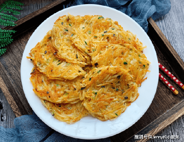 土豆去皮洗净,擦成细丝,直接用碗装着,不需要清洗。