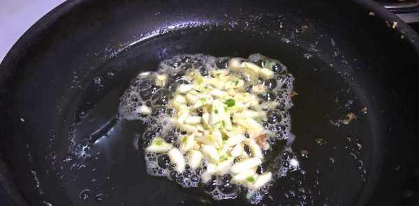 3:锅底再放入色拉油和蒜末,快速炒出蒜香,将新鲜香菇快速翻炒,待香菇翻动片刻。