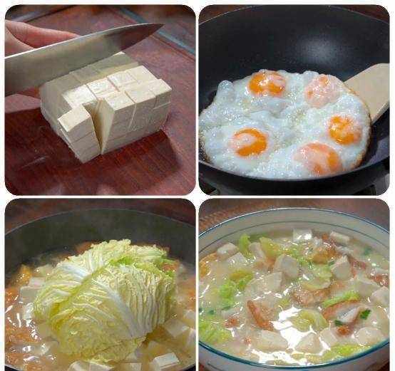 1、先准备一块豆腐,切成小方块备用,锅中倒油,打四个鸡蛋到碗里,不用打散,直接倒到锅中煎,翻面煎熟。