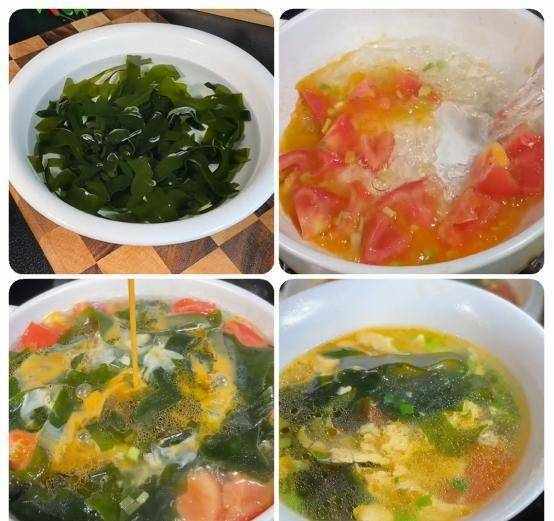 1、先拿一点海带放到水里面泡发,锅里倒油,放一点小葱,炒出香味,再下入切好的番茄炒出汁。