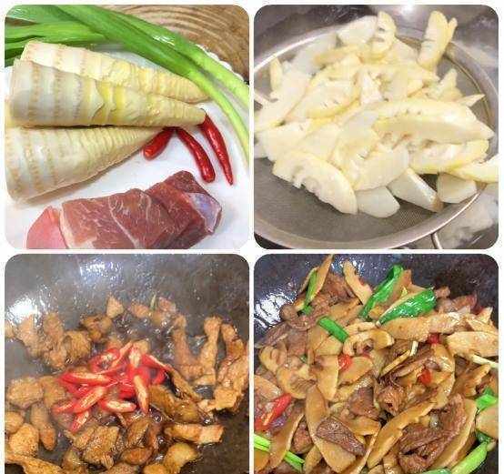 2、锅里烧开水,水开之后倒入春笋焯水,大火烫两分钟捞出备用。锅中倒油,放入肉片翻炒,加入一点蒜片,加入一点点生抽和老抽到锅中一起翻炒。
