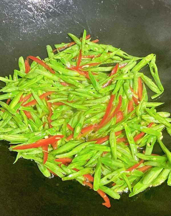 第五步:分别放入豆角丝和青椒丝,加入少许水,快速翻炒,盖上锅盖转小火焖2分钟左右。