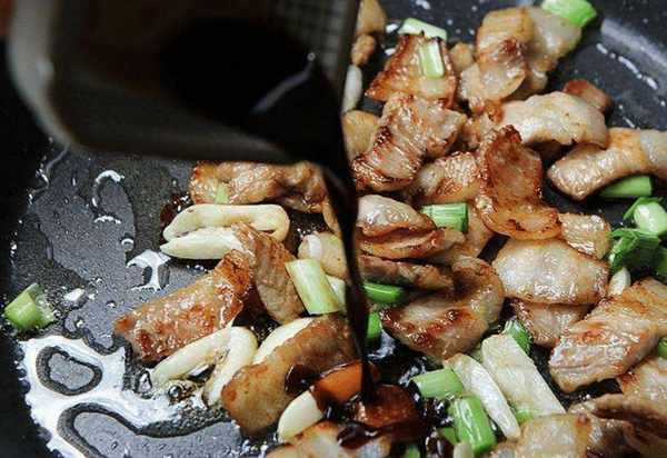 3:准备好以上材料,锅中加入热油,等油温60%左右热时,放入猪肉块翻炒,猪肉煎至两面焦黄,将五花肉煎至变色(证明五花肉熟了)