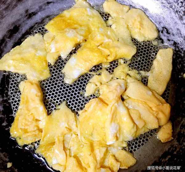 4:热锅加入冷油,加热至温热。先将蛋液放入锅中,均匀加热,煎至金黄。不断搅拌,稍煎片刻捞出待用。