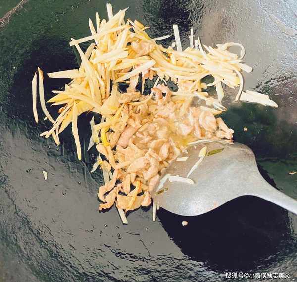 第四步:取锅烧热,迅速将瘦肉丝放入锅中快速煎瘦肉丝,至瘦肉丝变色即熟。