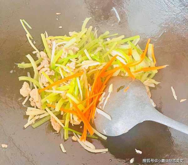 第五步:然后加入笋丝和芹菜片提香,也可以加入一些胡萝卜丝炒碎。