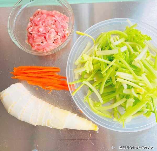 材料:准备香芹菜180克,笋半个(约200克,建议选择春笋,春笋要闻起来香,捏起来有弹性,水分充足),猪肉150克(一定要选择鲜嫩的猪肉,不要选择冷冻猪肉),生抽和蚝油少许,料酒少许,盐几勺,水淀粉少许,色拉油少许,白糖半勺等。