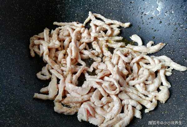 4:起锅后烧热锅,记得多加点食用油,然后姜蒜稍微翻炒一下,迅速把瘦肉丝滑入锅中,快速的把瘦肉丝翻炒至变色。