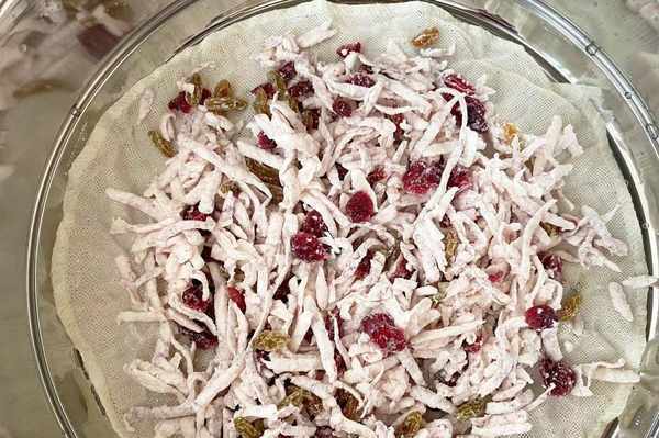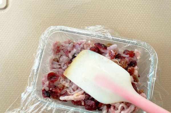 果干不一定是蔓越莓和葡萄干,黑加仑、草莓干什么都可以,家里有什么放什么,但不建议不放。