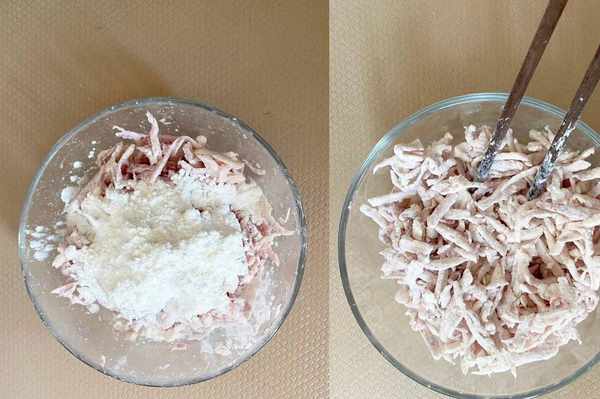 这一步需要妈妈们多点耐心去搅拌,尽量让每根芋头丝都沾上淀粉,这样蒸出来的芋头糕就不会变成一团。