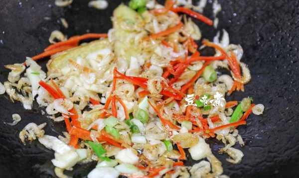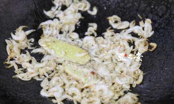 4.所有的材料准备好后,就可以开始做这道菜了。锅内烧热适量油,待油温上升后,放入姜片炒香。然后倒入拧干的虾皮一起炒。炒虾皮时要注意火候。