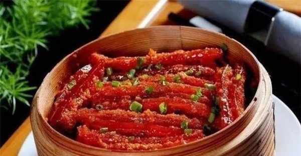 东乡蒸肉,是清远英德东华镇的一种特产美食。当地东乡蒸肉的制作过程非常考究,主要以猪腩肉为原料,制作时将猪腩肉洗净切片,然后再用油炸至金黄捞出控油,之后加入白糖,烧酒和盐等调料炒制一番,最后拌上炒芝麻放到蒸笼中蒸透即成。成菜后具有色泽金黄,香味浓郁,肥而不腻等特点,一直是当地民众用来招待亲朋好友的必备菜肴。