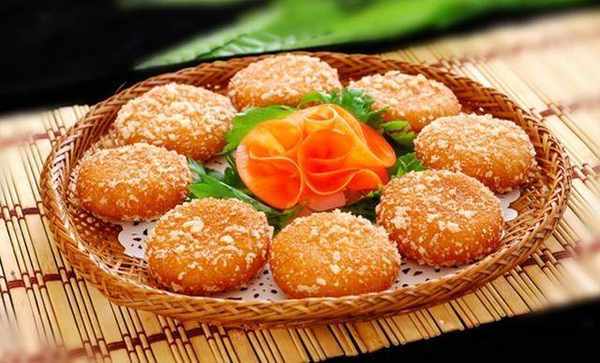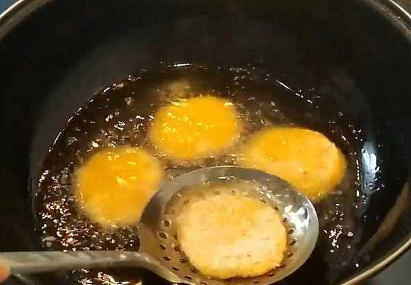 5、锅内油50%烧热,把南瓜放在面包屑上,用文火煎至两面金黄,装盘上桌。