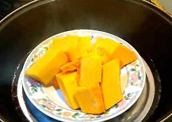 1、南瓜去皮切小块,放入蒸锅蒸20分钟左右。