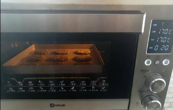 5、将烤盘放入预热好的烤箱中层,参考温度170度烤20分钟。饼干的厚度不同,烘烤时间也不同。建议根据常用烤箱灵活调整温度和时间。