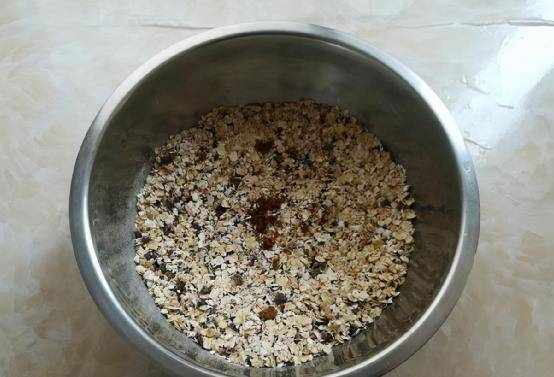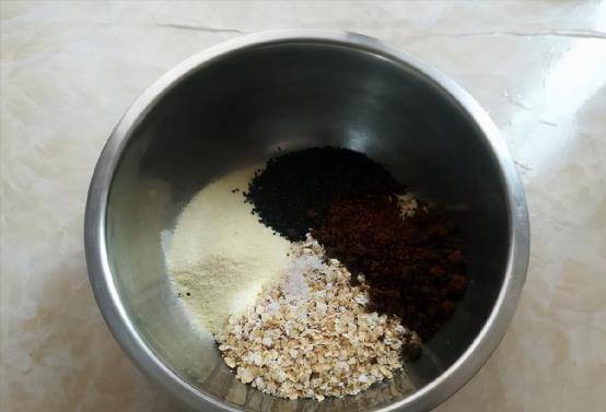 1、准备一个干净的无水锅,放入即食燕麦片、低筋面粉、红糖粉、奶粉、盐和黑芝麻。如果有椰丝,可以把奶粉换成椰丝,味道更好。