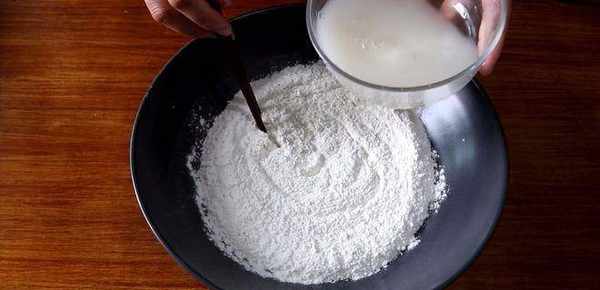 2。面粉加少许糖,倒入酵母水,慢慢拌入面粉片,用手揉成面团,盖上保鲜纸静置发酵一会。