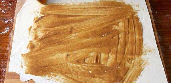 7。将面团擀开,抹上一层油,卷起来,擀成薄饼。