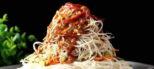 5.待面凉后捞出沥干水分,放入碗中,放入切好的黄瓜片、西红柿片和胡萝卜,淋上适量的麻酱,拌匀即可食用。