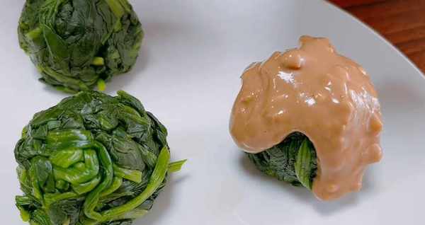 4。将准备好的芝麻酱淋在菠菜上,拌匀即可食用。